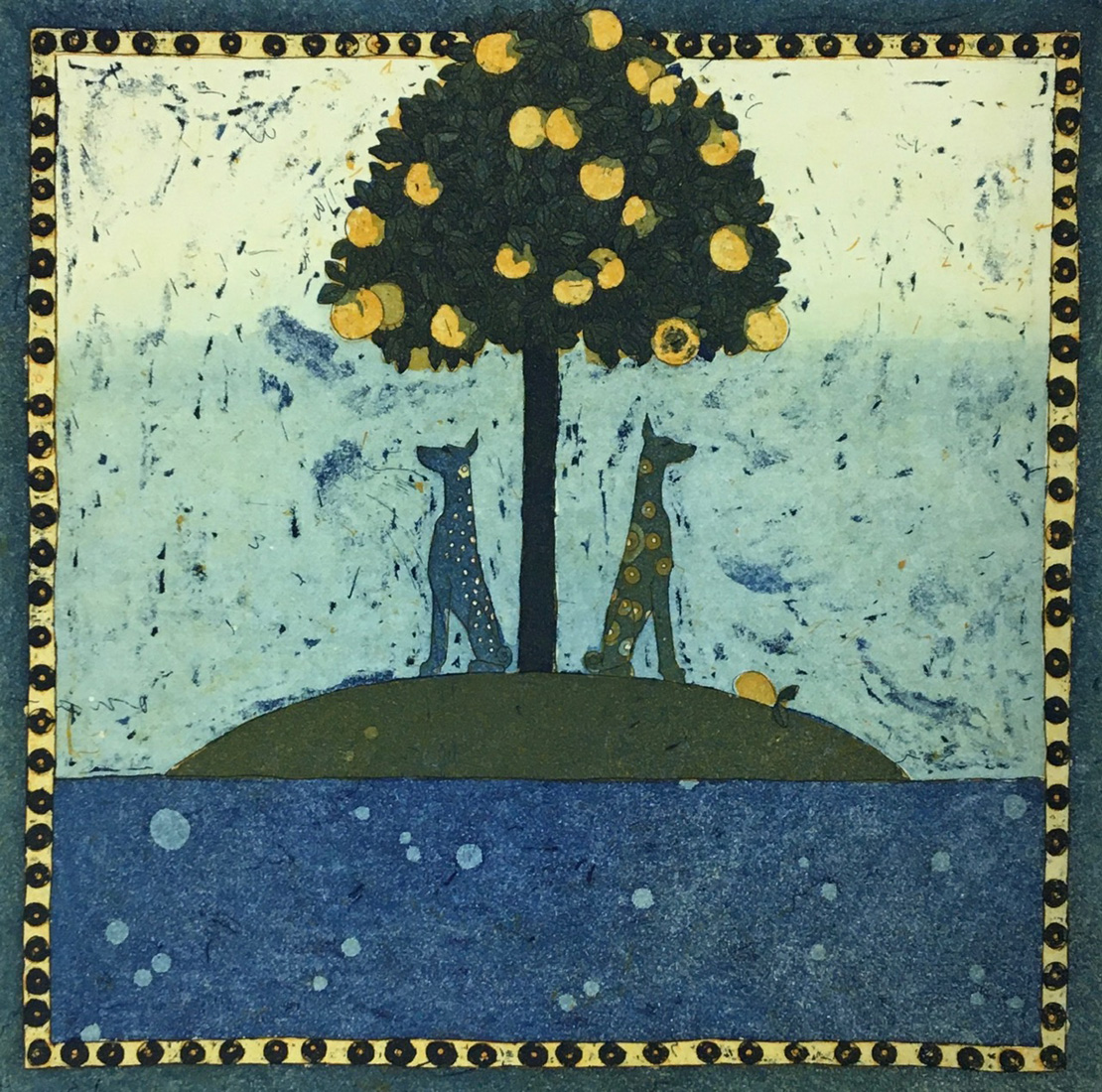 Kehystetty (Kehyksen tyyli: paspartout. Kehyslista: puu. Kehyslistan väri: kultahopea. Lasi: tavallinen. Ripustus: lanka.)