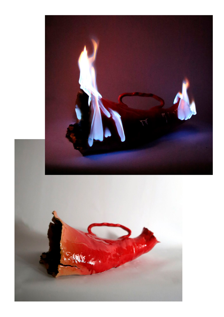 Keramiikka, autolakka, bitumi. Valokuva palavasta teoksesta 48x45,6cm